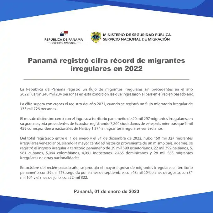 El número de migrantes irregulares que cruzaron Panamá es una cifra histórica al casi duplicar los 133.726 que lo hicieron en 2021 y los 8.594 en el 2020, destaca el escrito.