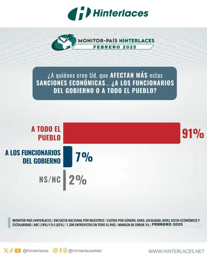 A través de sus redes sociales, Hinterlaces publicó el documento Monitor País Febrero 2025, en el cual revela “un mayoritario rechazo a las sanciones”.