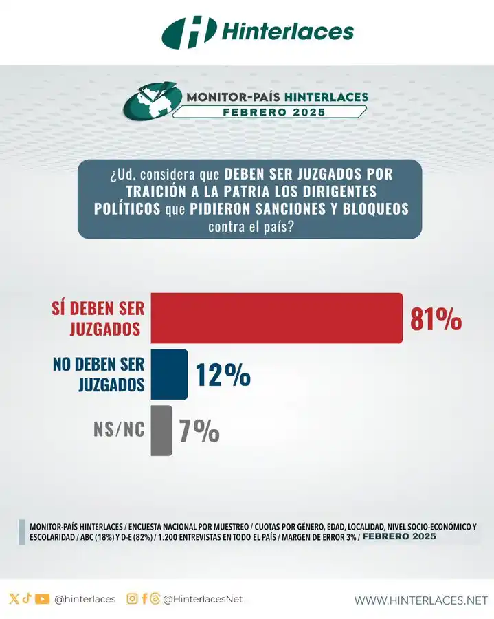 - 81% de los venezolanos cree que quienes pidieron sanciones deben ser juzgados por traición a la patria.