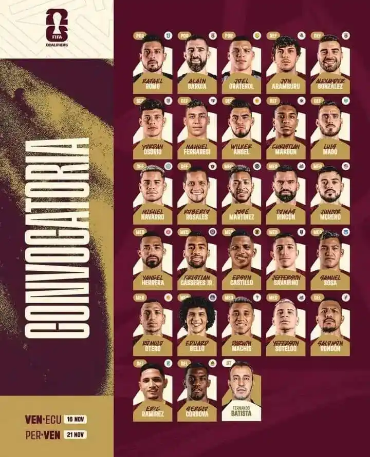 La selección de Venezuela desveló cuáles son los jugadores que estarán disponibles para la doble fecha de las Eliminatorias mundialistas, en donde buscan un cupo para clasificar por primera vez a un mundial de fútbol.