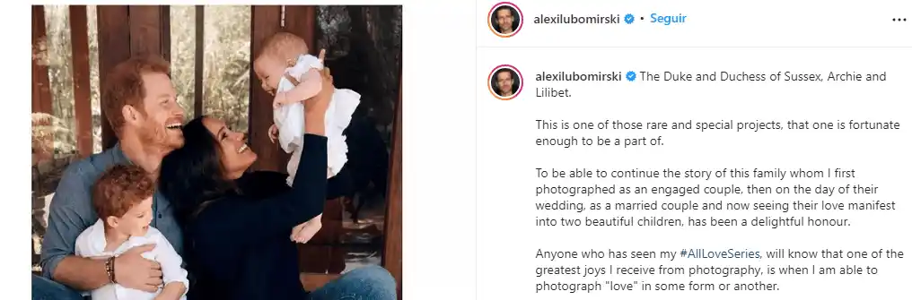 también el fotógrafo que retrató a la familia en su casa, Alexi Lubomirski, la publicó en su cuenta de Instagram. «El duque y la duquesa de Sussex, Archie y Lilibet. Este es uno de esos proyectos raros y especiales, del que uno tiene la suerte de ser parte. Poder continuar la historia de esta familia a la que primero fotografié como pareja de novios; luego el día de su boda, como pareja casada; y ahora ver su amor manifestarse en dos hermosos hijos, ha sido un gran honor. Cualquiera que haya visto mi #AllLoveSeries, sabrá que una de las mayores alegrías que recibo de la fotografía es cuando puedo fotografiar el «amor» de una forma u otra», escribió.