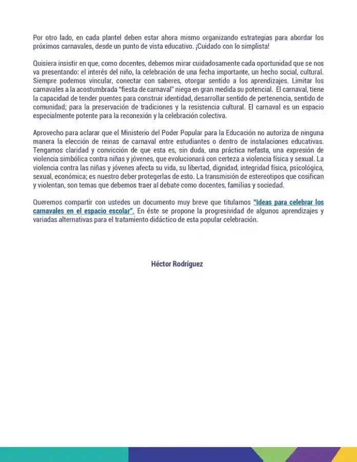 En el Boletín Informativo número 16 de fecha 13 de febrero, el Ministro de Educación, Héctor Rodríguez, suspendió las elecciones de reinas de carnaval en las instituciones educativas.
