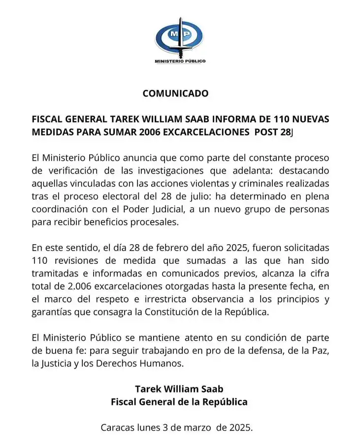 Fiscal General Tarek William Saab informó mediante un comunicado del @MinpublicoVEN sobre la aprobación de 110 nuevas medidas procesales solicitadas el 28Feb, sumando así 2006 excarcelaciones postelectorales. pic.twitter.com/yFvfONfnUw