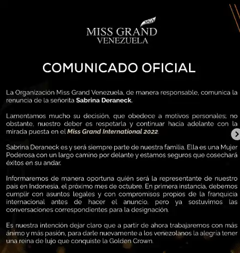 Asimismo, el Miss Grand Venezuela, aunque lamentó la decisión, apoyó a Denareck. «Lamentamos muchos su decisión, que obedece a motivos personales. No obstante, nuestro deber es respetarla y continuar hacia adelante con la mirada puesta en el Miss Grand International, 2022».