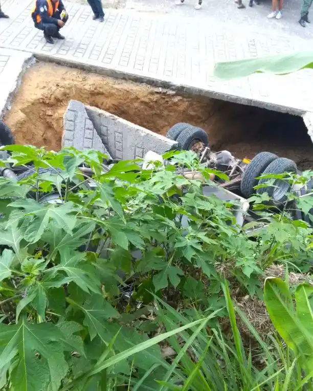 En redes sociales se pudo apreciar como el terreno aparentemente ha cedido, originándose así un hueco considerable, que posiblemente permitió la fragmentación de la placa de cemento.