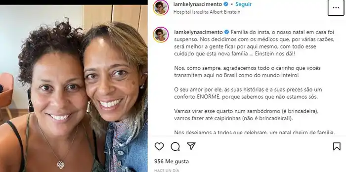 «Nuestra Navidad en casa fue suspendida. Decidimos junto con los médicos que, por varias razones, será mejor que nos quedemos por aquí, con todo el cuidado que esta nueva familia [del hospital Albert] Einstein nos da», escribió en Instagram Kely Nascimento, una de las hijas del exfutbolista.