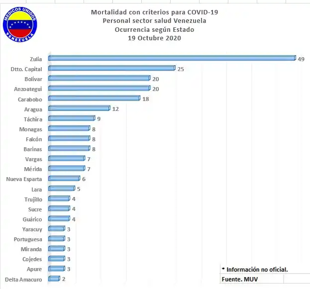 Los estados que registran la mayor cantidad de fallecidos son: Zulia (49), Distrito Capital (25), Bolívar (20) y Anzoátegui (20).