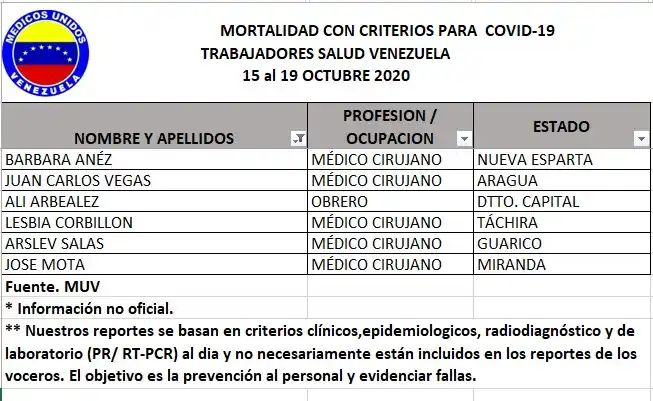 La ONG Médicos Unidos por Venezuela denunció este martes que aumentó a 231 el número de muertos en el sector salud. Del 15 al 19 de octubre se registraron otras 6 víctimas, cinco médicos y un obrero.
