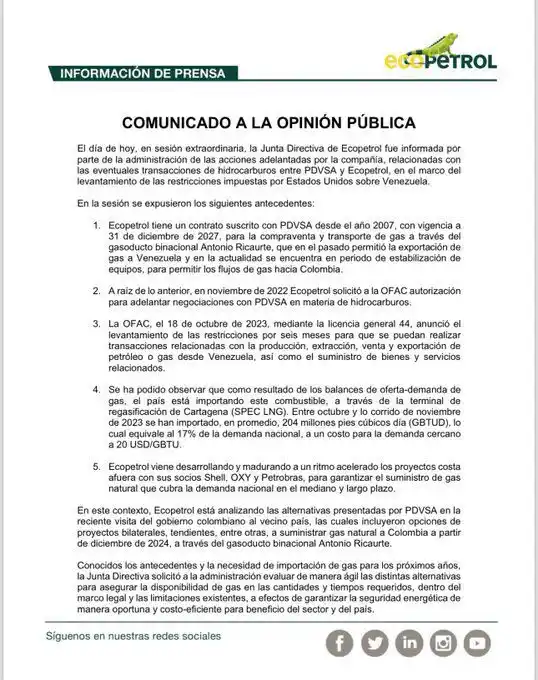 «Ecopetrol está analizando las alternativas presentadas por Pdvsa en la reciente visita del gobierno colombiano al vecino país, las cuales incluyeron opciones de proyectos bilaterales, tendientes, entre otras, a suministrar gas natural a Colombia a partir de diciembre de 2024″.