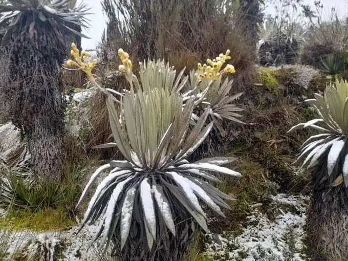 Las increíbles imágenes dan cuenta de un manto blanco de nieve que cubrió la vegetación del páramo, rodeada también por frailejones.