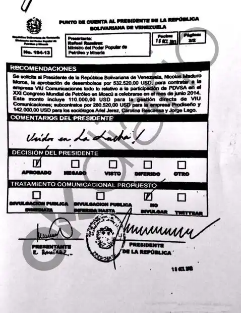 Los documentos presentados al público en exclusiva por OKDiario muestran una orden de pago con firmas del entonces ministro de Petróleo Rafael Ramírez y del propio Nicolás Maduro Moros.