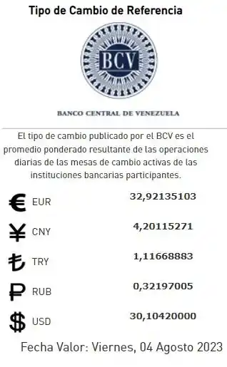 Así se pudo constatar este jueves al cierre de la mesa de cambio con la banca, donde se determinó que el valor del dólar BCV para este viernes 4 de agosto será de 30,10 bolívares.