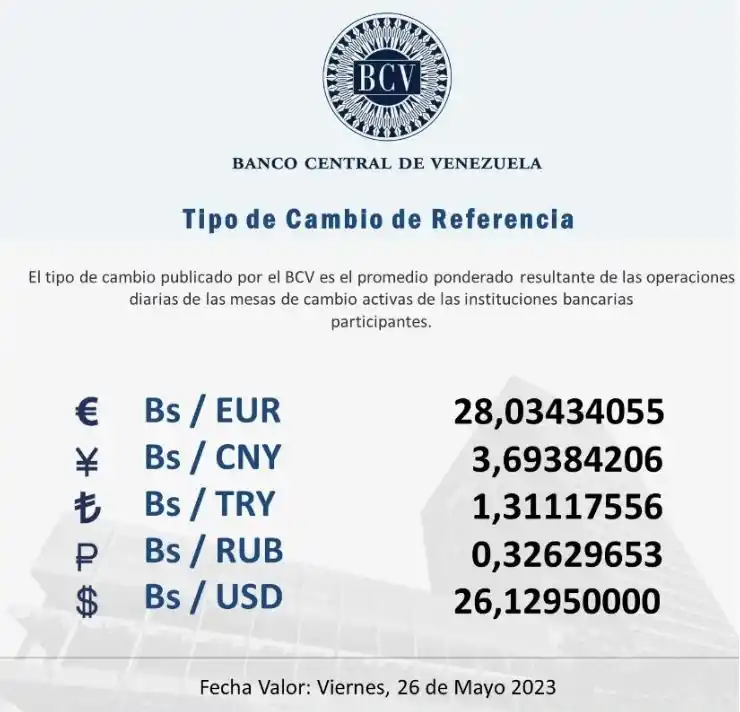 Por otra lado, el Banco Central de Venezuela (BCV), ente encargado de compartir la tasa oficial de la divisa, fijó su cotización en Bs. 26,13.