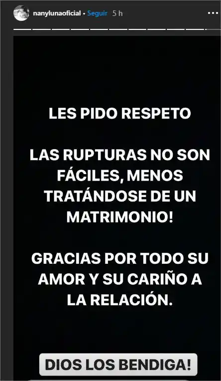 Lo que tenía semanas corriendo se concretó este miércoles, cuando la vedette Nany Luna confirmó en sus historias de Instagram que el matrimonio que tenía con Vanessa Senior está roto.