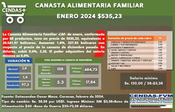 Según el Cendas-FVM, el precio de la Canasta Alimentaria Familiar (CAF) de enero, se ubicó en 535,23 dólares, equivalentes a Bs.20.541,97, lo cual denota un aumento de 1,6%, en relación con el mes de diciembre.