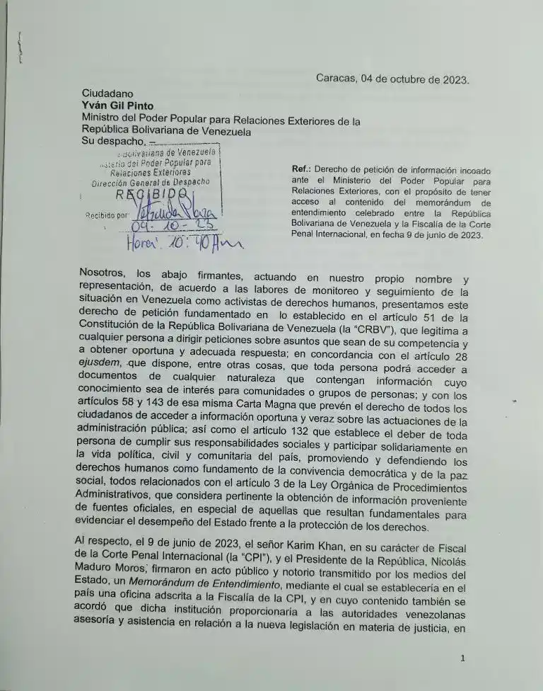 Por ello, representantes de estas organizaciones acudieron al Ministerio de Relaciones Exteriores para entregar una carta dirigida al titular del despacho, Yván Gil Pinto, con la finalidad de pedir «información referida al contenido del Memorándum de Entendimiento suscrito el pasado 9 de junio por el Estado venezolano con la Fiscalía de la Corte Penal Internacional (CPI), para permitir la instalación de una oficina del órgano en nuestro país».