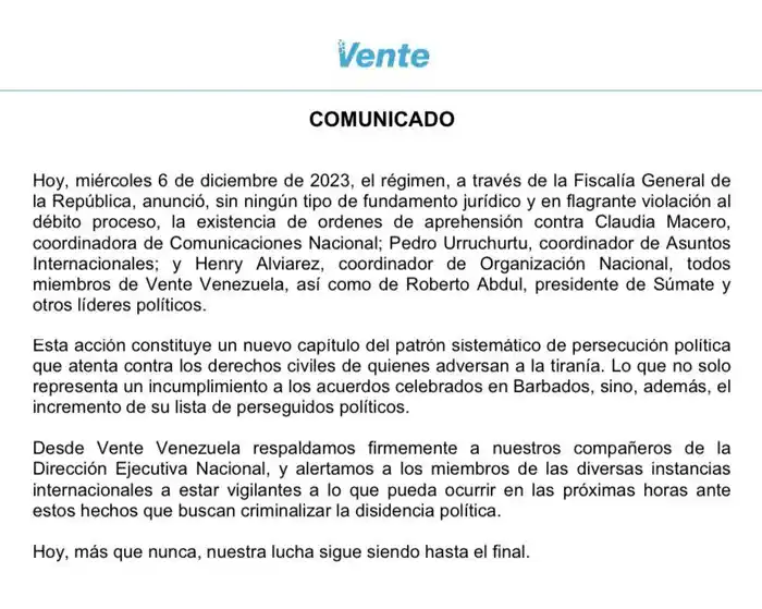 En este sentido, el partido Vente Venezuela emitió un comunicado en defensa de sus militantes.