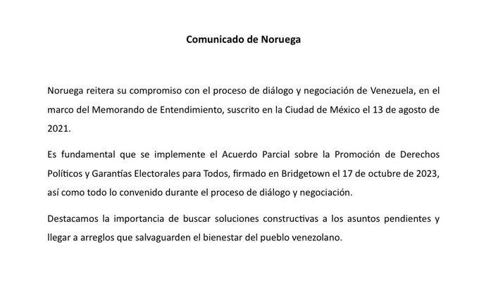 Cabe recordar que Noruega ha servido como mediador del diálogo entre la administración de Nicolás Maduro y la oposición y que, en octubre del 2023, sirvió como garante de los acuerdos firmados entre las partes, en Barbados.