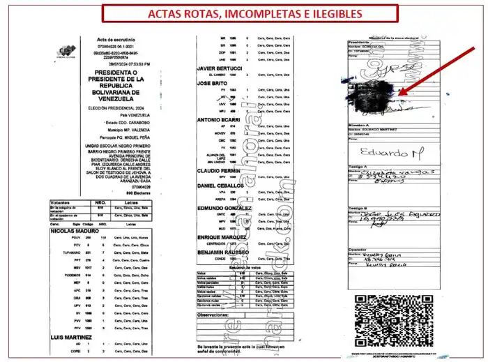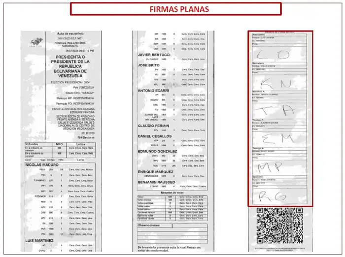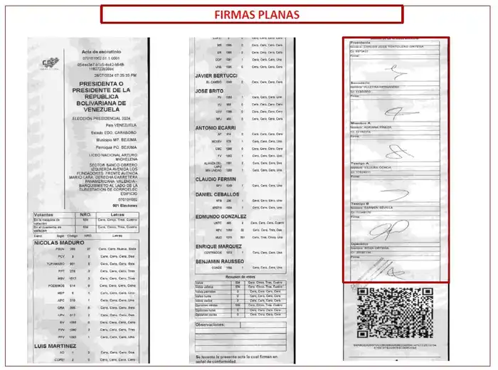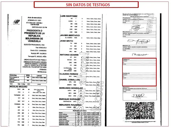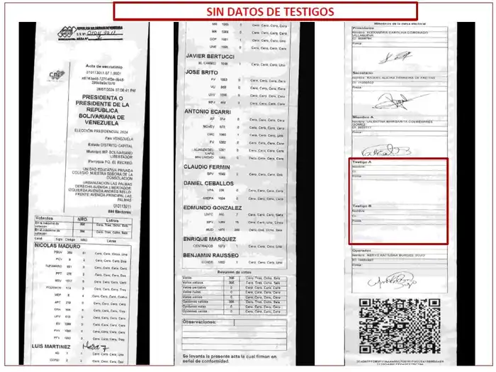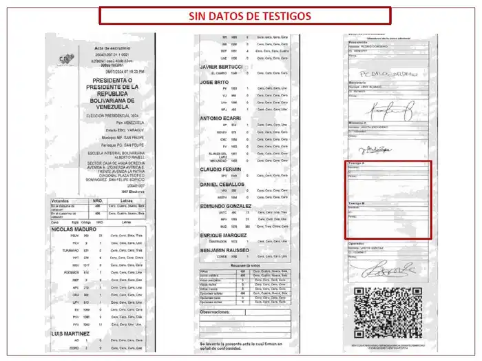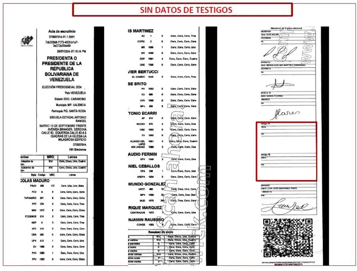 - La presentación de «actas» en las cuales faltan las firmas de los operadores de mesa, o de los testigos, incluyendo testigos del PSUV, a pesar de tener este partido testigos en todas las mesas.