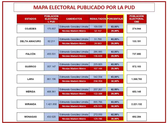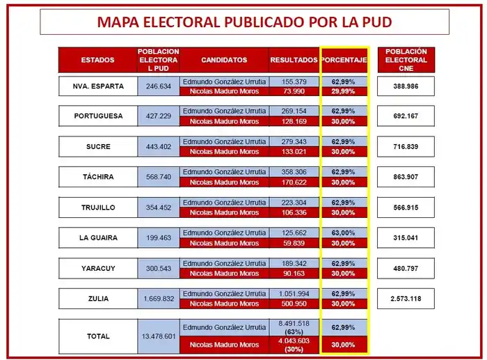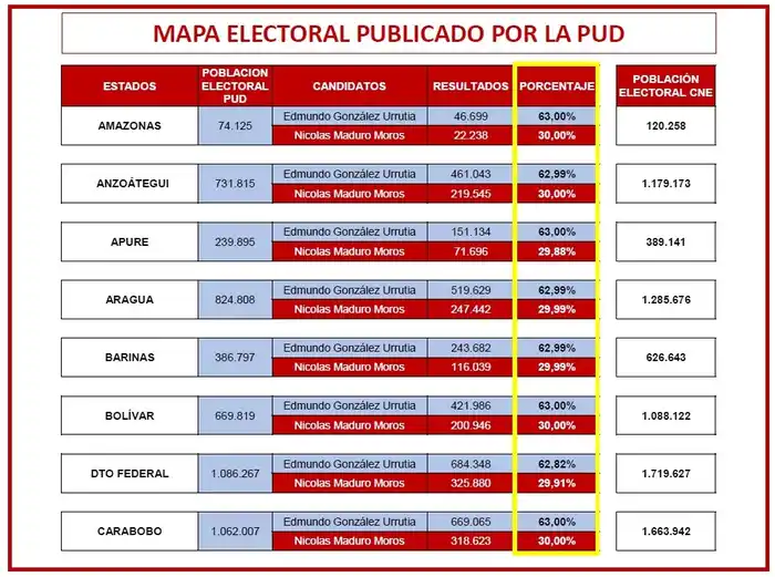 - Inconsistencias matemáticas en los resultados presentados, que da para todos los estados resultados del 63 por ciento para Edmundo González y 30 por ciento para Nicolás Maduro.