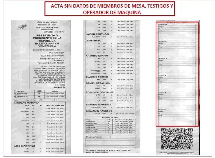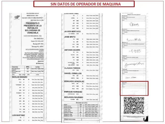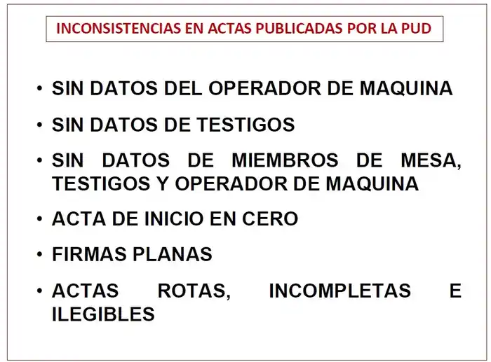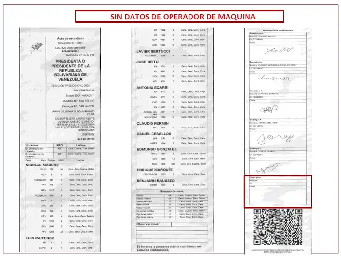 Indicó que «no puede haber ni siquiera un acta sin datos, porque eso invalida todo el proceso». Puso como ejemplo que en las actas no aparecen las firmas que se hicieron en la máquina de votación, «no en un papel». Mostró que la firma del operador, que es quien suscribe que en efecto el acto ocurrió allí, no está en las actas que él mostró.