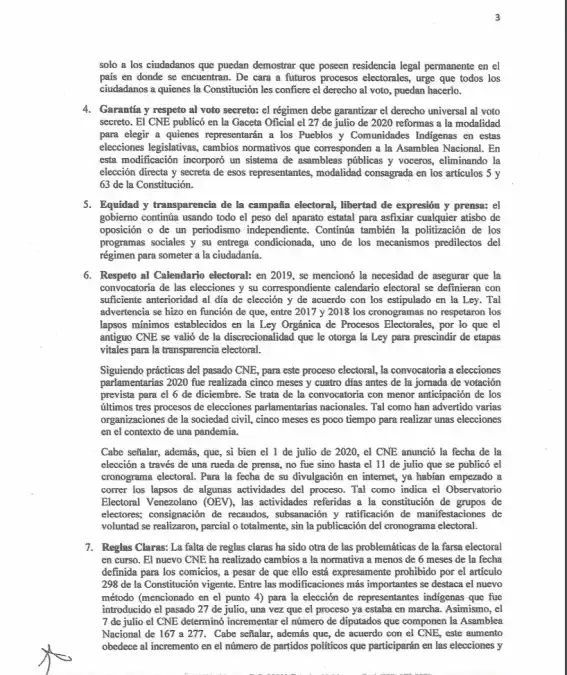 “El desmantelamiento paulatino pero constante de las instituciones democráticas venezolanas es evidente. En Venezuela no se respeta ninguno de los cinco elementos básicos de una democracia representativa, establecidos en la Carta Democrática Interamericana», señala el escrito.