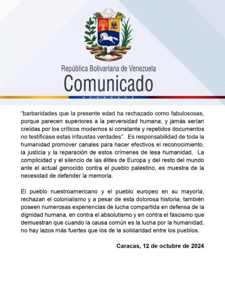 El gobierno de Venezuela condenó este 12 octubre la más feroz agresión conocida por la humanidad en la época de la colonia