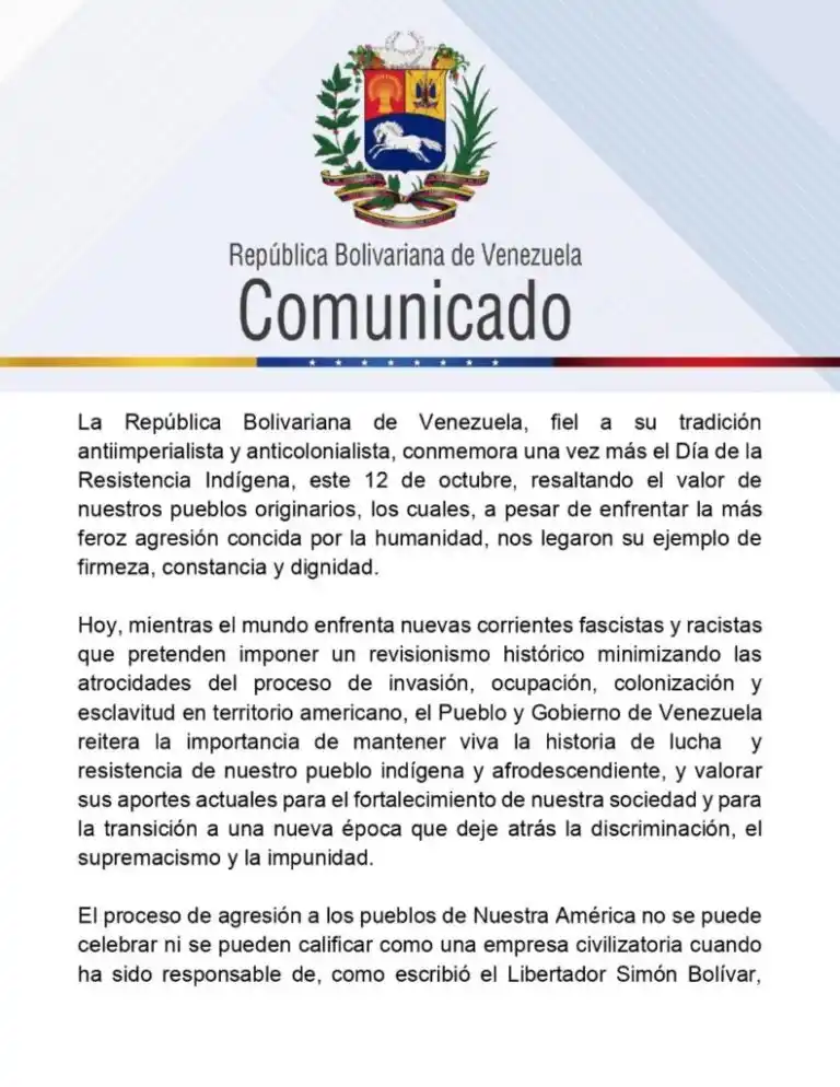 El presidente Nicolás Maduro, a través de un comunicado, llamó a “mantener viva” la historia de lucha y resistencia indígena frente a la más feroz agresión conocida por la humanidad, en la época de la colonia, y a promover canales para hacer efectivos el reconocimiento, la justicia y la reparación de estos crímenes de lesa humanidad.