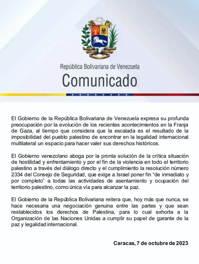 Por su parte, la administración de Nicolás Maduro, a través de la cancillería, emitió un comunicado, donde por ningún lado condena el ataque, ni menciona los muertos y menos califica los hechos como un acto terroristas de Hamás.