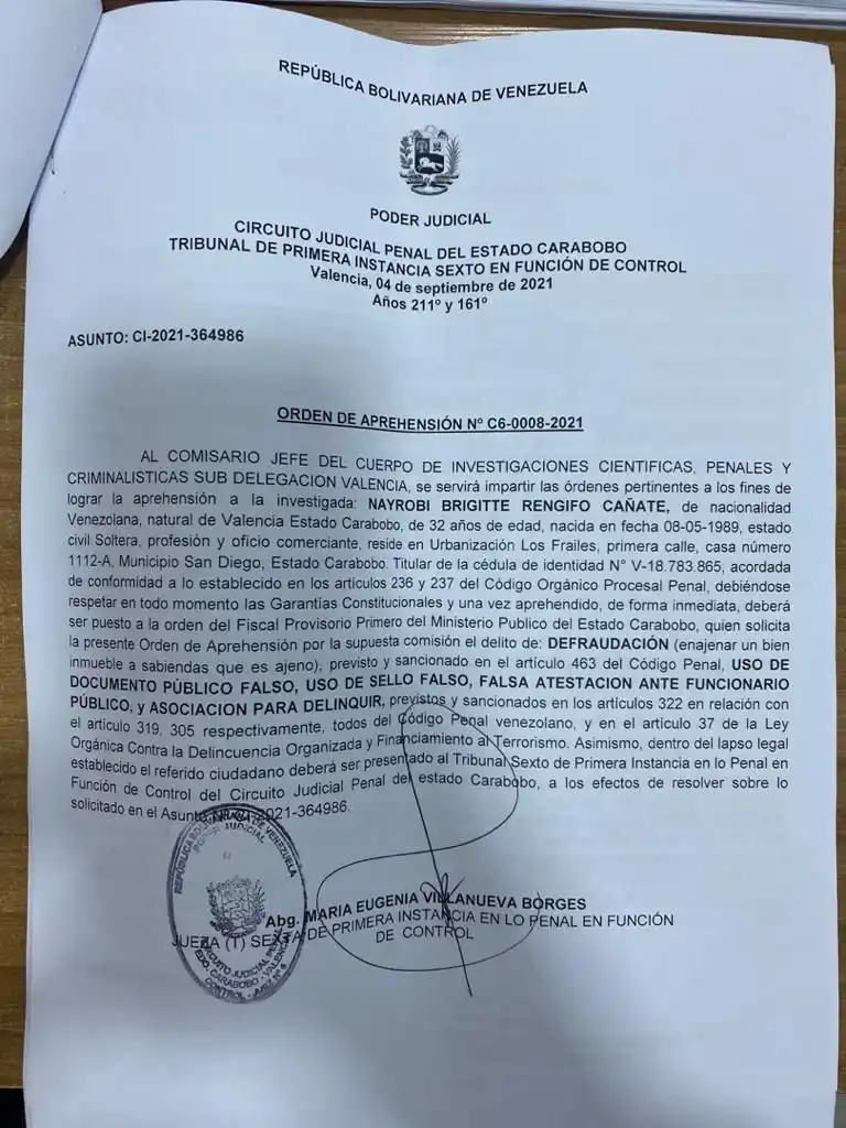 La orden de aprehensión contra Rengifo fue emitida, el pasado 4 de septiembre, por el circuito judicial penal del estado Carabobo.
