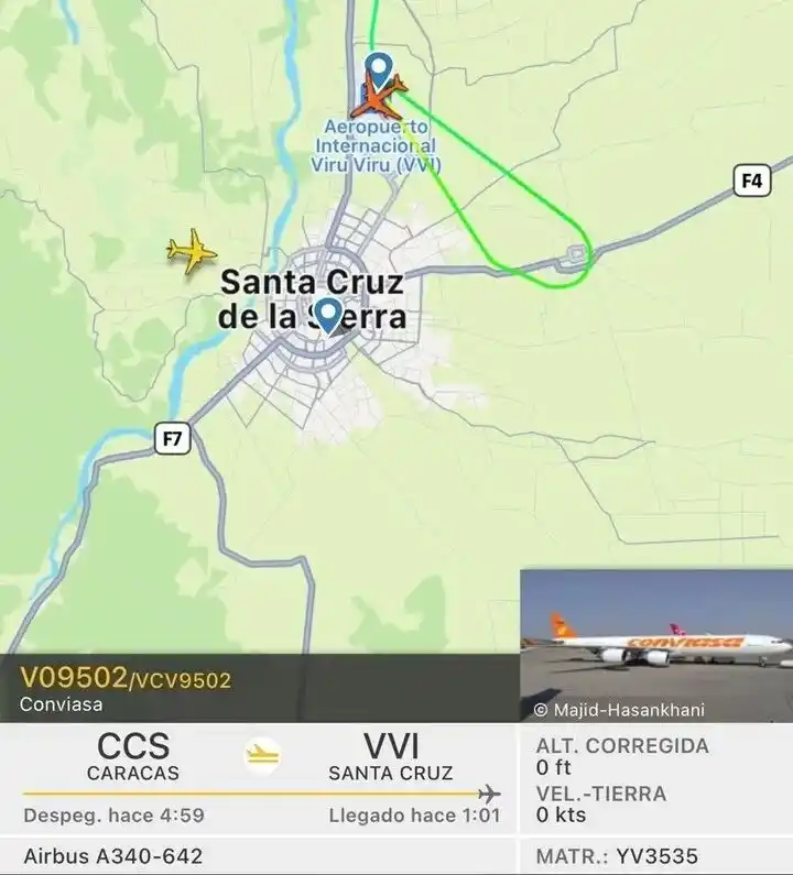 El diario argentino Clarín, detalló que el vuelo VO9502 de la aerolínea estatal venezolana Conviasa que debía aterrizar este miércoles en el aeropuerto internacional de Ezeiza finalmente no llegará a la Argentina: según fuentes oficiales consultadas por este diario, la operación finalizaría en Bolivia, donde estaba prevista la escala técnica, y sería una aeronave de aquel país la que completaría la ruta a Buenos Aires.