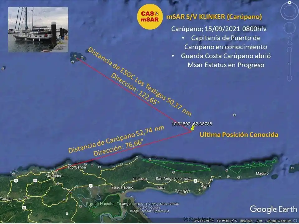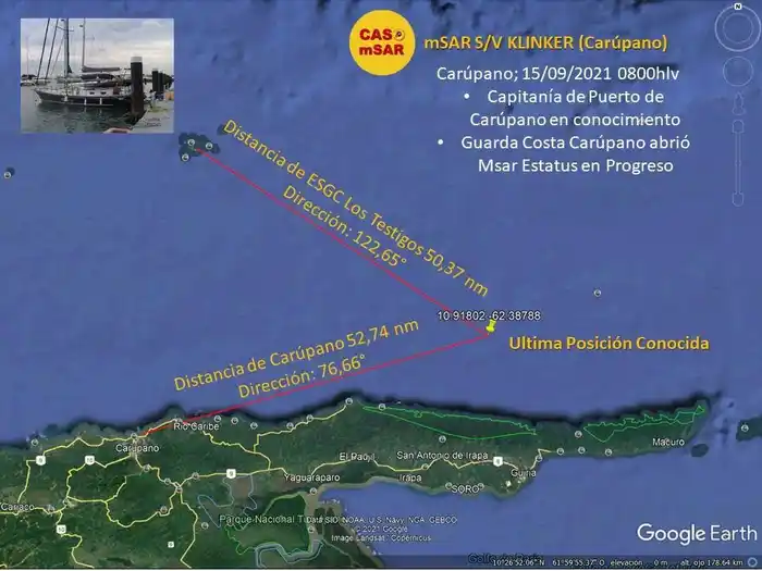 Luis Guillermo Inciarte, vicecomodoro del Cuerpo de Apoyo y Salvamento Marítimo (Onsa), organismo no gubernamental de rescate, indicó que de parte de las autoridades competentes recibieron el pasado martes que una señal de emergencia se activó desde la embarcación tipo velero llamada Klinker.