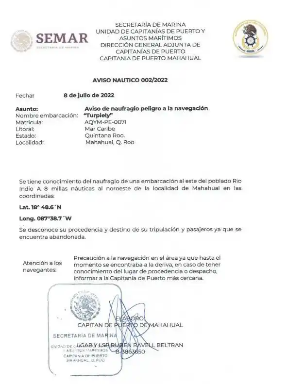“De acuerdo a la información suministrada, por la Capitanía de Puerto de Mahaual, Provincia de Quintana Roo, México, mediante el AVISO NÁUTICO 002/2022, se identificó un BUQUE de PESCA, VENEZOLANO, MATRÍCULA AQYM-PE-0071, correspondiente a la Capitanía de Puerto de La Vela, de nombre: TURPIAL V.”, dice parte de la minuta.