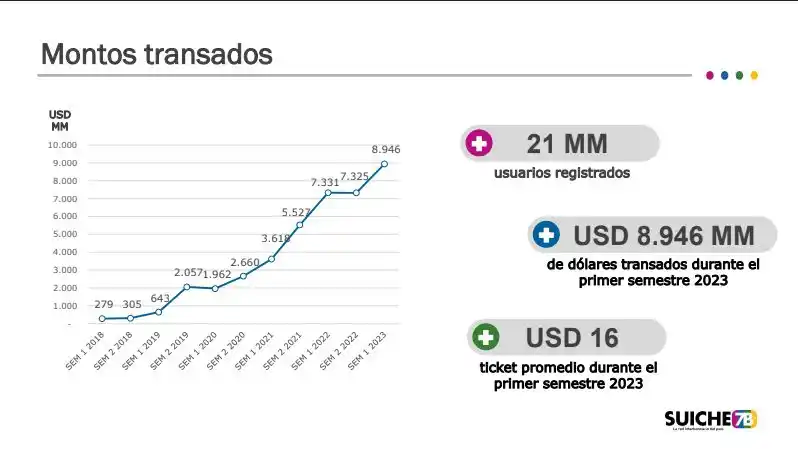 Para el primer semestre del 2023 han registrado 687 millones de transacciones, las cuales representan alrededor de 8 mil 946 millones de dólares, en un universo de aproximadamente 21 millones de usuarios.