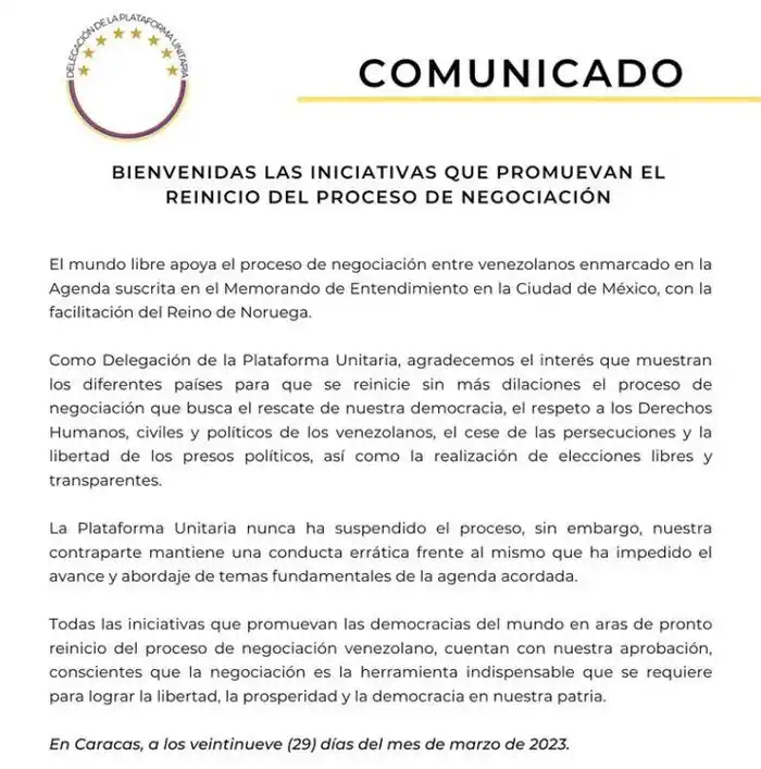 La coalición de oposición venezolana Plataforma Unitaria emitió este miércoles un comunicado donde dan la «bienvenida a las iniciativas» que promuevan el reinicio del proceso de negociación con al administración de Nicolás Maduro en México.