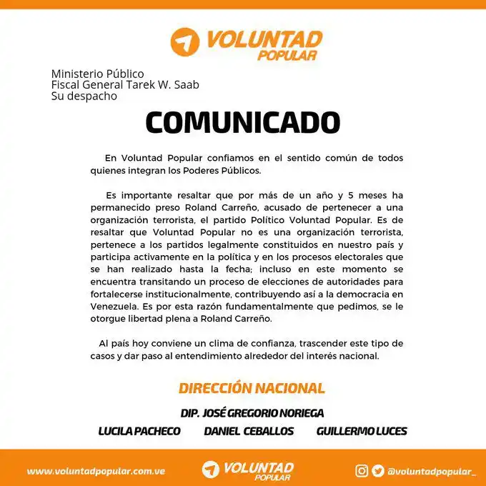 Entre tanto, a través de un comunicado, el partido Voluntad Popular, ratificó la exigencia de la «liberación inmediata» de Roland Carreño.