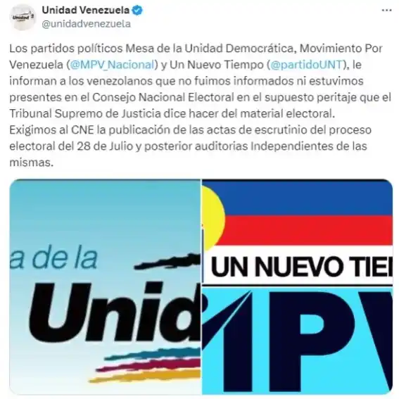 «No fuimos informados ni estuvimos presentes en el Consejo Nacional Electoral en el supuesto peritaje que el Tribunal Supremo de Justicia dice hacer del material electoral», aseguró la coalición opositora en un mensaje publicado en la red social X.