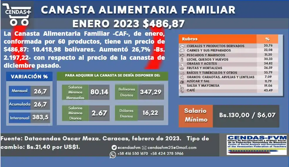 El Centro de Documentación y Análisis Social (Cendas-FVM) calculó el costo de la Canasta Alimentaria Familiar (CAF) de enero en 486,87 dólares, equivalentes a 10.418 bolívares al tipo de cambio del 31 de enero.