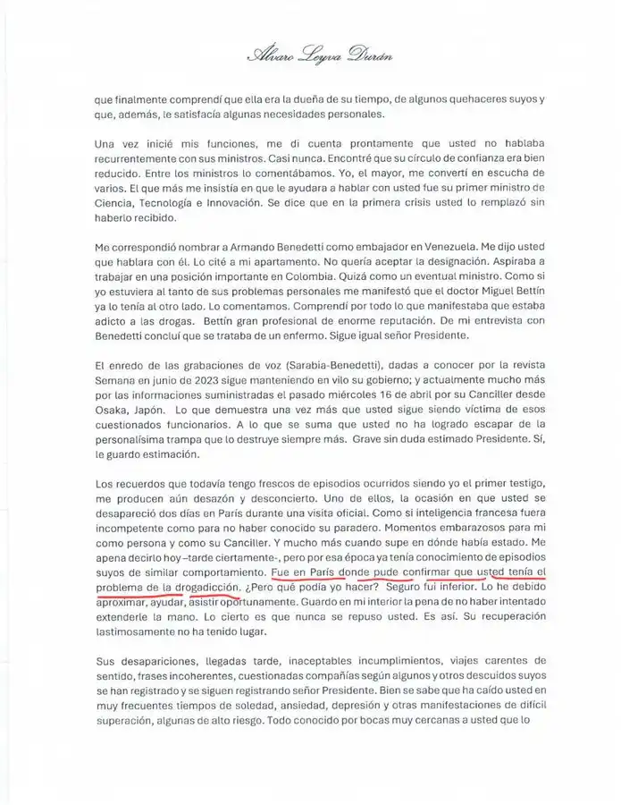 Leyva también señaló que un «estrechísimo colaborador» de Petro consume cocaína. Esas declaraciones se han interpretado como mensajes contra Armando Benedetti, la mano derecha del mandatario y actual ministro del Interior.