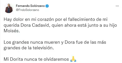 Uno de los mensajes más emotivos fue el de Jorge Abello, protagonista de Betty la fea. «Sabes la adoración que te profesaba. Me alegra que puedas encontrarte con Moisés que era tu anhelo desde que partió. Si ves a Fer por allá mándale un abrazo. Que tu viaje sea lleno de luz y de amor como la vida que dejas. Adiós, querida Dorita».