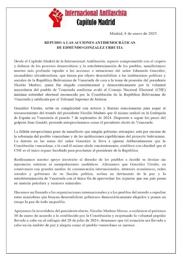 Por otro lado, la Internacional Antifascista, capítulo Madrid, lanzó igualmente un comunicado repudiando lo que considera «acciones antidemocráticas» del excandidato opositor Edmundo González.