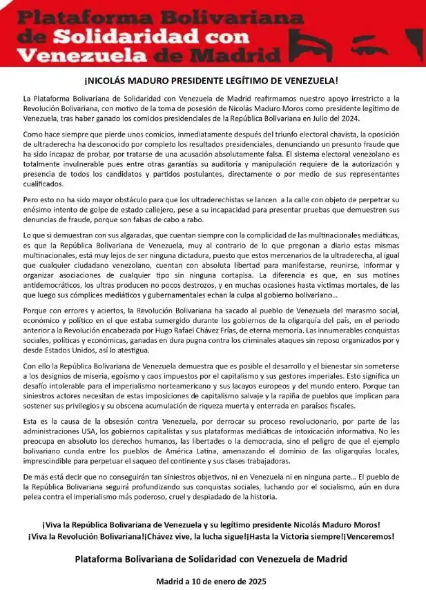 Por una partes, la Plataforma Bolivariana de Solidaridad con Venezuela de Madrid emitió un comunicado donde reafirmó su apoyo a la Revolución Bolivariana y a su líder, Nicolás Maduro, con motivo de su toma de posesión presidencial este 10 de enero.