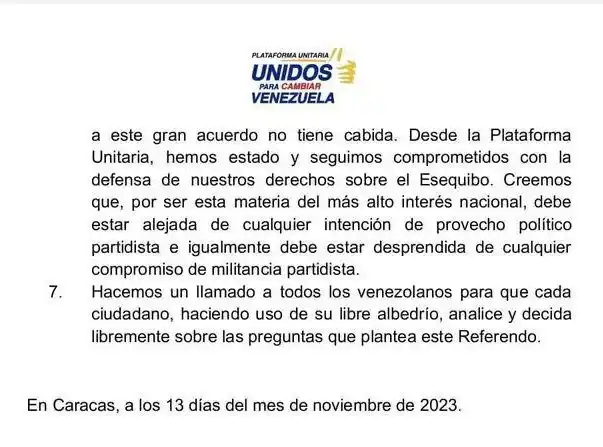 La Plataforma Unitaria fijó posición este lunes acerca del referendo consultivo sobre el Esequibo a realizarse el próximo 3 de diciembre. La agrupación opositora aseguró en un comunicado estar comprometida con la defensa del territorio nacional.