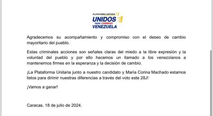 La Plataforma Unitaria Democrática condenó este jueves el atentado contra el equipo de María Corina Machado en Barquisimeto, estado Lara e instó a las autoridades a rechazar este tipo de acciones y garantizar un proceso electoral en paz.