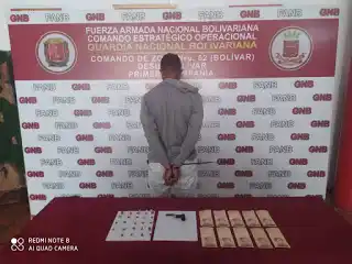 De igual manera en el sector Canavayen vía Río Claro de San Félix, estado Bolívar, militares capturaron a Michael Deivis Carreño Pino luego de encontrarle en su poder 6,93 gramos de presunta droga denominada Crispy distribuida en veinticuatro envoltorios; una pipa de fabricación casera y la cantidad de quinientos mil bolívares en efectivo.
