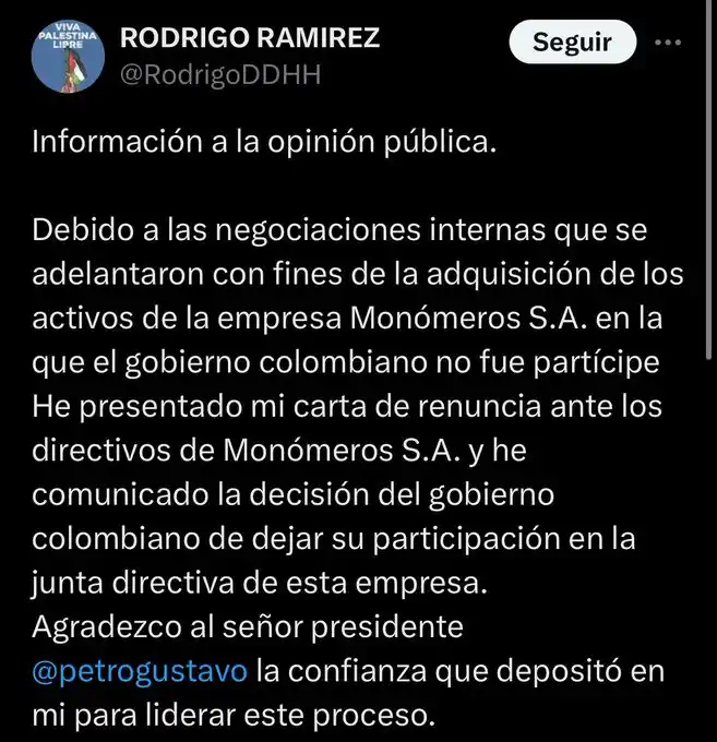 El director de Monómeros, Rodrigo Ramírez, dijo por sus redes sociales que se va de la compañía en vista de las negociaciones de las cuales él no forma parte