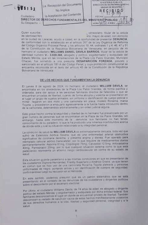 “Los abogados de Defiende Venezuela, pese a las múltiples trabas del Ministerio Público, lograron presentar hoy la denuncia escrita por la desaparición forzada de Williams Dávila. Funcionarios de la fiscalía retuvieron el documento por media hora en otra oficina, esperando autorización para recibirlo”, detalla el post.
