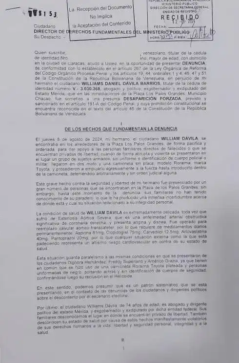 Entre tanto, el hijo del exgobernador de Mérida, publicó en sus RR.SS.: “Hemos intentado presentar recursos en la fiscalía para conocer el paradero de mi padre Williams Dávila, pero no nos los reciben. Parece que los derechos humanos solo operan de lunes a viernes, aunque las violaciones no tienen horario”, criticó.