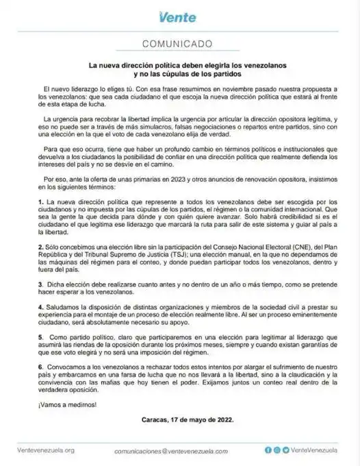 Vente Venezuela está de acuerdo con la realización de unas primarias para designar un candidato de la oposición, unitario, con miras a las presidenciales del 2024