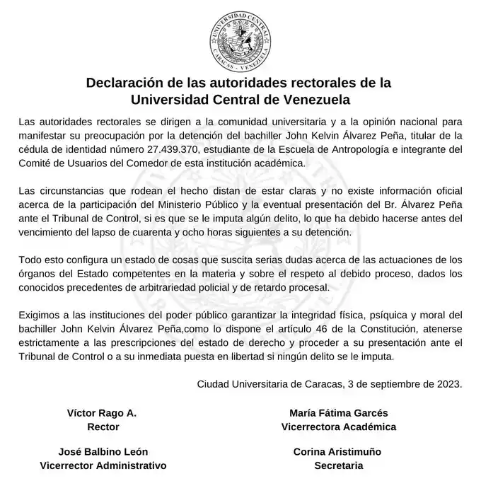 Al saberse de la audiencia de presentación de Álvarez, el presidente de la FCU-UCV, Jesús Mendoza, también pidió su liberación inmediata.